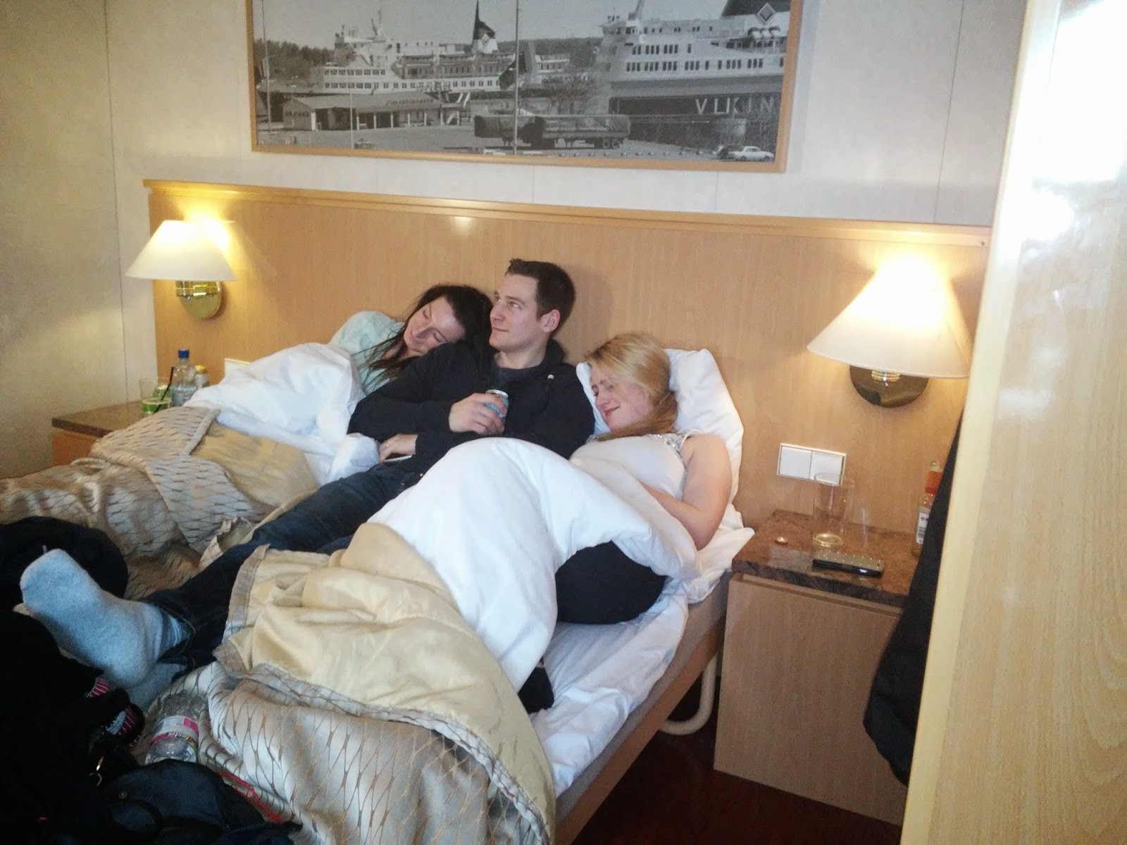 Innan vi kom ombord på båten hade vi redan tappat 2 av oss. Men alla hittade till hytten och hittade en sittplats åt sig, eller liggplats. Vi hade bokat en lyxhytt så vi alla sku rymmas, och den var nog värd pengarna. Hytten i sig var inget "wow" men det var roligt med utrymme och att vi kunde umgås alla tillsammans utan att behöva skrika åt varandra i någon bar. Och fast någon innan vi bokade tyckte att "jag behöver inte skita på en guldbytta" var nog alla alla ändå så nöjda med hytten. Och till deras besvikelse fanns det ingen guldbytta, men ett stort badrum där 4 karlar bra fick plats!